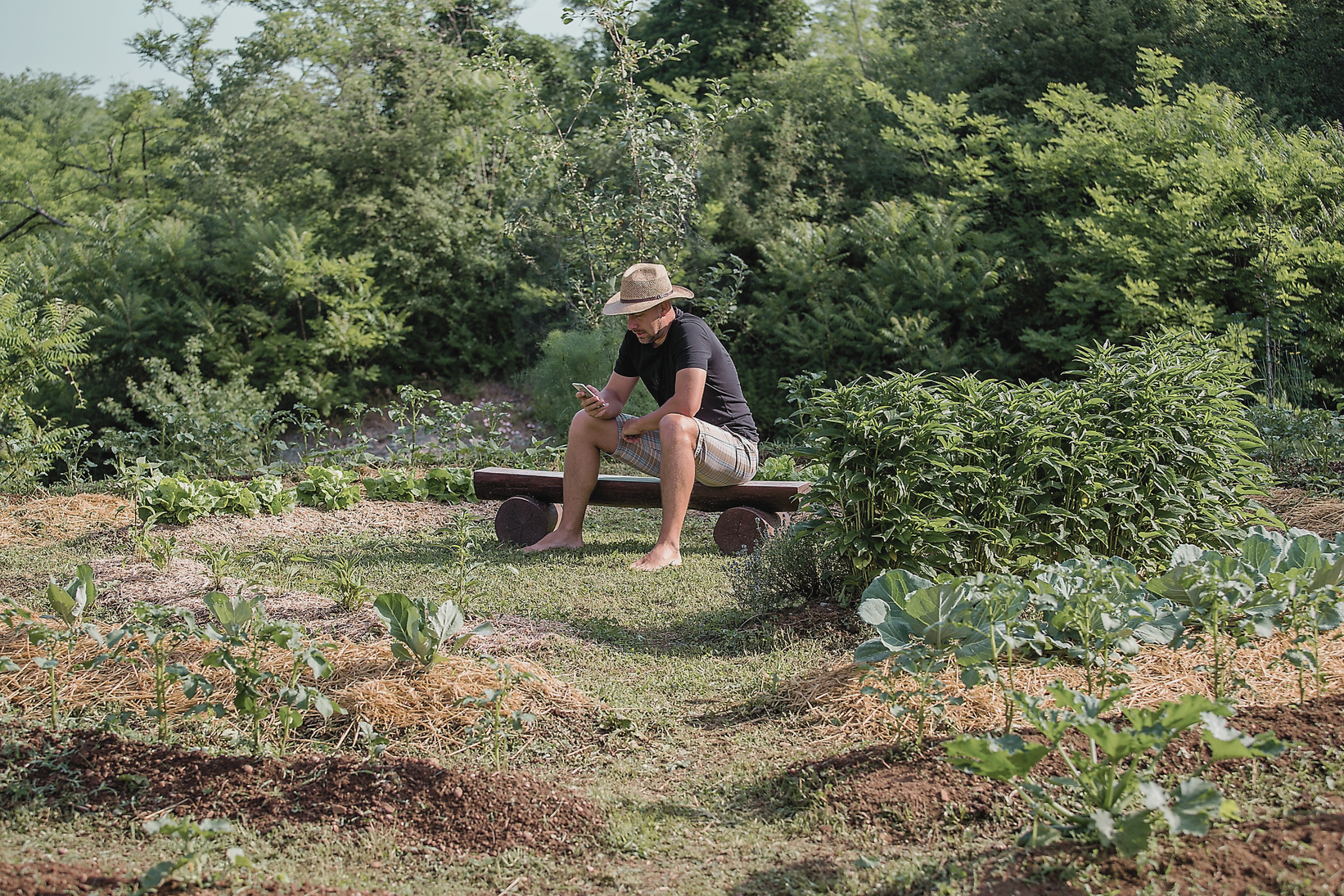 Dans une forêt comestible, la biomasse est importante avec peu de vides entre les plantes et l'une d'entre elles doit parfois être retirée pour donner un peu d'air à ses voisines. Dans un jardin traditionnel, en revanche, les plantes sont espacées sur un sol nu ce qui offre des conditions idéales pour la prolifération des mauvaises herbes garantissant un entretien plus conséquent.